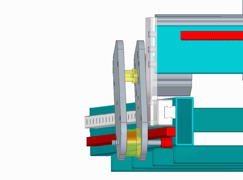 Um nicht mehr Platz als notwendig zu verschwenden, habe ich mich dazu entschieden die Motoren so zu drehen, dass sie in die Fräse ragen. Zurzeit sind die Halterungen aus Holz gefertigt. Sobald die Fräse fertig ist, sollen diese Teile dann aus Aluminium gefräst werden. Des weiteren habe ich mich für eine Übersetzung von 1:3 entschieden. Meine Motoren habe ein Drehmoment von 1.9 Nm nach der Übersetzung komme ich also auf 5.7 Nm, durch die bei mir eingestellten 1/4 Mikroschritte fällt das Drehmoment wieder ein wenig. In meinem Fall gehe ich von ca. 4.5Nm pro Motor aus.